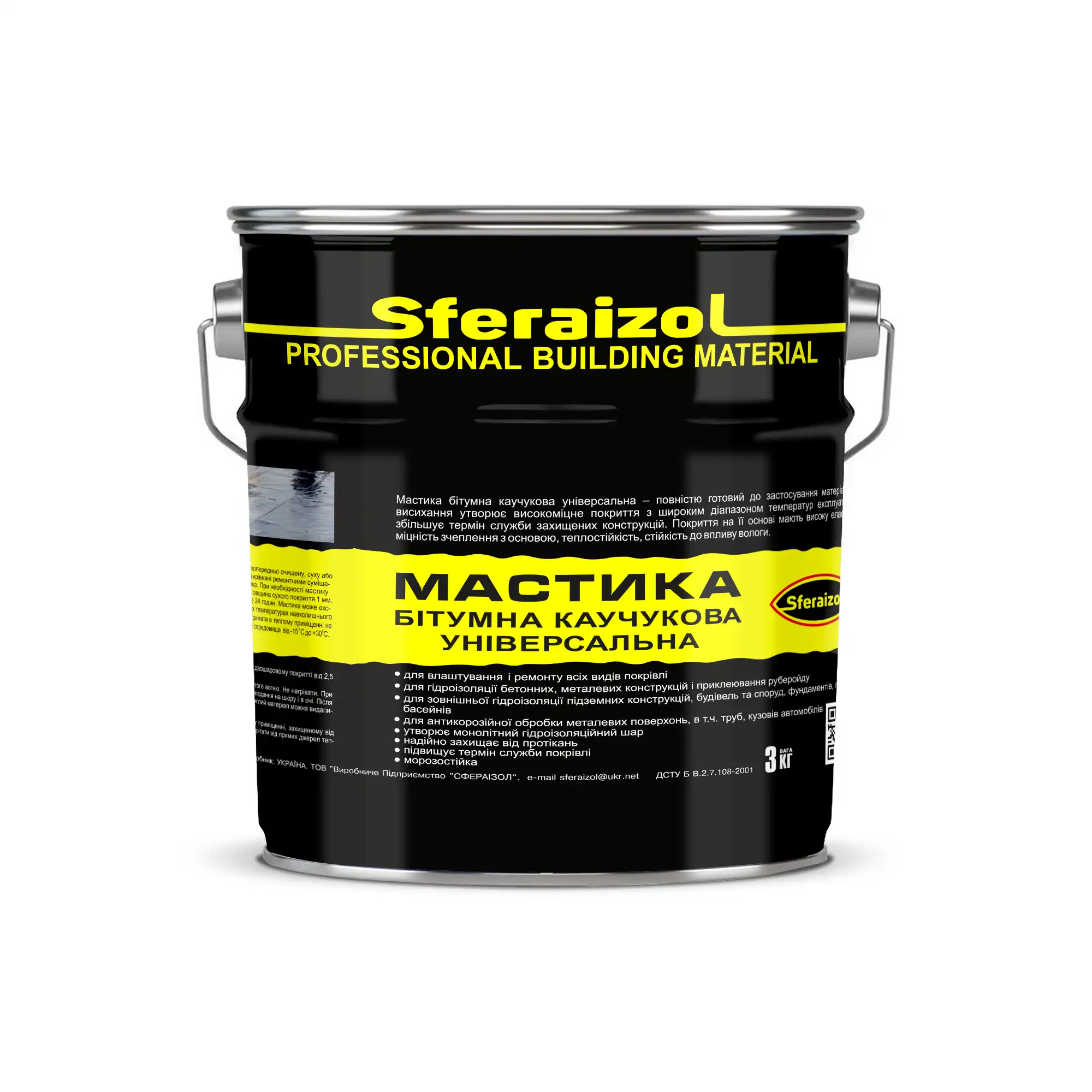 Мастика бітумна каучукова універсальна – повністю готова до використання бітумна маса для холодного склеювання покрівельних поверхонь, легких гідроізоляційних матеріалів і руберойду. Створює еластичну плівку, що щільно приклеюється до основи. Після висихання утворює високоміцне покриття з широким діапазоном температур експлуатації, яке збільшує термін служби захищених конструкцій. Покриття на її основі мають високу еластичність, міцність зчеплення з основою, теплостійкість, стійкість до впливу вологи. Модифікована синтетичним каучуком, з додаванням хімічних сполук, що покращують зчепність до різних основ, сухих та вологих. Еластична і стійка до дії води, слабких кислот, та агресивних речовин, що містяться в грунті на розчиннику.